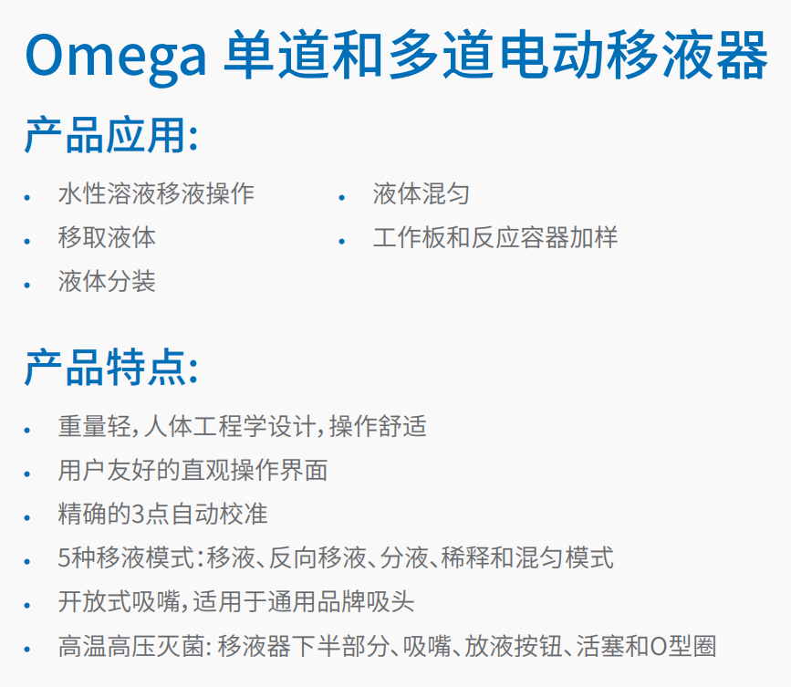 重量轻,人体工程学设计,操作舒适。5种移液模式:移液、反向移液、分液、稀释和混匀模式。开放式吸嘴,适用于通用品牌吸头。